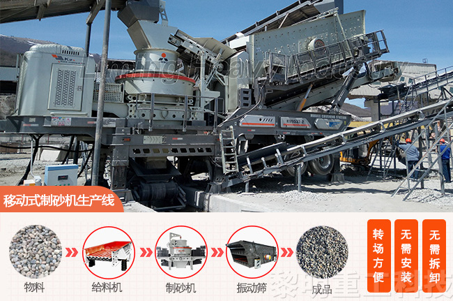特點(diǎn):快速搭建和拆卸、方便運(yùn)輸和移動(dòng)。移動(dòng)式制砂機(jī)適合在場地受限、需要頻繁轉(zhuǎn)移或需要快速搭建制砂生產(chǎn)線的場景中使用。